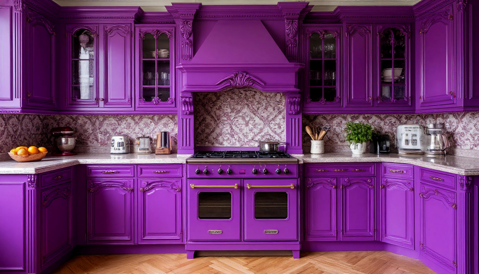 Интерьер с такой кухней будет гармоничным как в большом доме с высокими потолками, так и в городской квартире, где хочется добавить немного дворцового дыхания. При правильном освещении фиолетовые фасады играют, словно живые, отражая мягкий свет люстр или подсветки. Добавьте к этому нежные текстильные элементы — лёгкие шторы, бархатные сидения, хрустальные вазы — и получите ансамбль, в котором каждая деталь продолжает мотив величия и уюта.