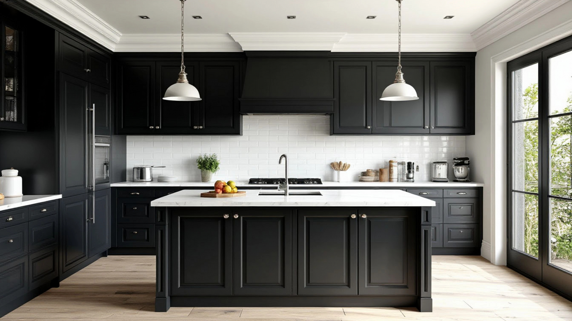 Столешница и рабочая зона выполнены в светлом, тёплом белом оттенке, который напоминает чуть влажный песок на берегу. Это не холодная белизна, а спокойный, мягкий тон, добавляющий свет и визуальное пространство. Переходы между чёрными и белыми зонами тщательно продуманы, чтобы не создавать резкости — всё выглядит органично, как плавный переход глубины моря к прибрежной полосе. Благодаря этому кухня не ощущается резкой или чрезмерно контрастной — наоборот, она остаётся уютной и комфортной для повседневной жизни.